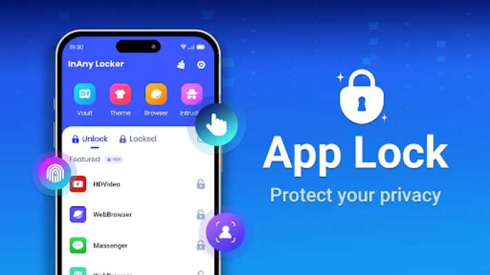 Uygulama Kilidi - Parmak İzi Kilidi, hepsi bir arada gizlilik koruyucunuzdur; uygulamaları kilitleyin, videoları, fotoğrafları ve mesajları PIN, desen, parmak izi ve yüz kimliğiyle gizleyin. Tek dokunuşla özel verilerinizi güvence altına alır ve yetkisiz erişimi anında durdurur. Telefonunuzu yavaşlatmadan sorunsuz ve hızlı korumanın keyfini çıkarın. Gizliliğinizi zahmetsizce koruyun.