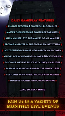 Vampires Dark Rising is a free to play, 2-D text-based RPG game. VDR introduces the story, characters and universe of a newly rising, vampire inhabited Darkside world