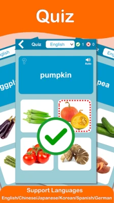 The app provides the best way to get started learning many kinds of vegetables which contains many cards, each word card are voice-enabled, and related words and pictures.