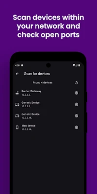 Features 1. Shows wifi details 2. Scans for devices(or hosts) on network 3. Scans for open ports of target IP 4. Shows ISP details