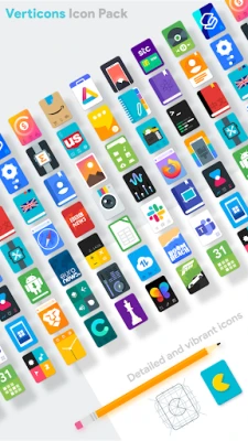 Verticons is a rectangular card material icon pack that loosely sticks to material design guidelines, tweaking them for a fresh user experience. In particular this icon pack avoids use of long shadow and makes extensive use of drop shadows and vivid colors.