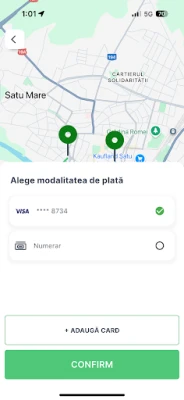 - Alege între plată cu cardul direct în aplicație sau numerar.