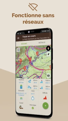- Enregistrer votre trace en direct et suivre votre progression sur la carte (distance, durée, dénivelé…). Si vous vous perdez, vous pourrez retourner sur vos pas grâce à la trace enregistrée.