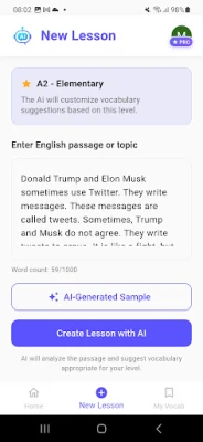 With VocabAI, learners can input any text they want to study. Our AI engine will analyze the content and automatically identify new or challenging words and idioms based on the user’s proficiency level. It then generates personalized vocabulary lists, interactive exercises, and learning videos tailored to the content.