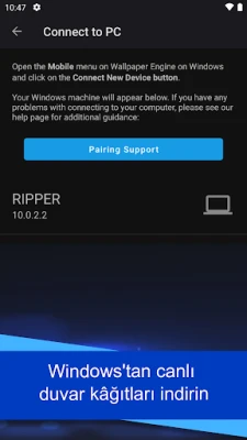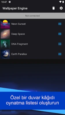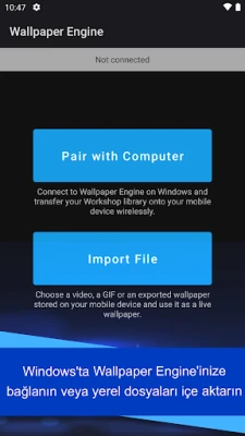 Wallpaper Engine mobil tamamlayıcı uygulaması, canlı duvar kağıdı koleksiyonunuzu kolaylıkla Android cihazınıza aktarmanıza olanak tanır. Windows'ta Wallpaper Engine'e bağlanın ve canlı duvar kağıdı koleksiyonunuzu mobil uygulamaya aktarın ya da yerel videoları ve GIF'leri içe aktarın ve bunları kolaylıkla canlı duvar kağıtları olarak kullanın!
