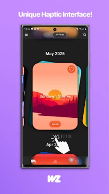 - Our unique patent-pending UI showcases our wallpapers in Packs, ordered by release date, each with a haptic thumbwheel that allows you to preview them with ease.