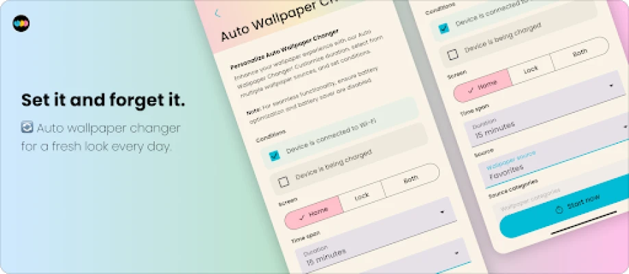 Set up automatic wallpaper changes at your preferred interval. Choose categories and let WallsPy refresh your home screen effortlessly.