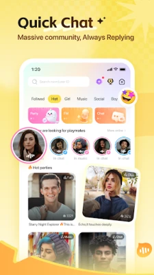 Let's start your voice journey together! 【Voice Chat】: Live online, voice chat; when you meet an interesting topic, use your voice to convey mood and get closer to each other. 【Theme Room】: Chatting, online party, online karaoke, various ways of interaction and the atmosphere is super high! 【Active Square】:Life catch, mood sharing, your story with him/her, starting with mutual likes. 【Interactive Games】:"Who is the Undercover" and other brain-burning interactive games are in progress, are you a genius player or a bad gamer? The game is waiting for you!