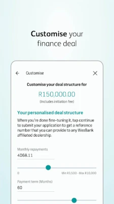 The WesBank App is a complete, end to end vehicle finance platform. It allows our customers the ability to easily apply and check for vehicle finance, customise their deals, manage them accordingly and sign their finance contracts all under one app.