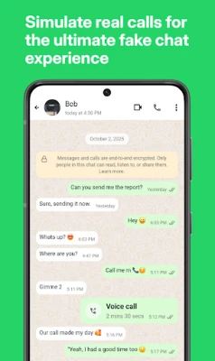 Total customization for fake WhatsApp chats, prank call logs, and fake status updates.