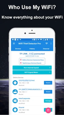 The app is a the simplest network scanner, ip scanner and wifi scanner that allows you to detect who is on my wifi and you can block the thief in router settings from my wifi router. Using WiFi Thief Detector Pro - Who Use My WiFi?, in seconds you know how many and which devices is connected to your wifi router with IP, MAC ID and vendor listing.