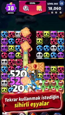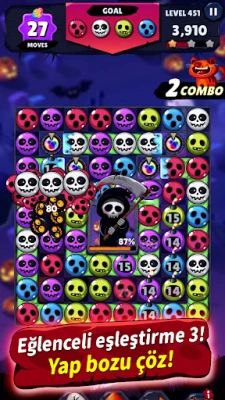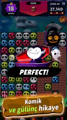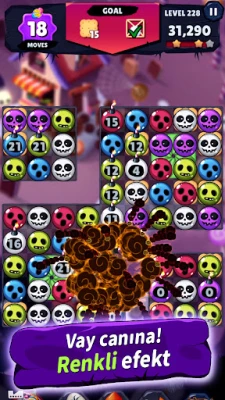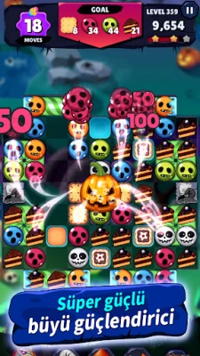 Çeşitli renklerde Halloween şekerleri var. Şekeri parmağınla hareket ettirir ve aynı renkten 3 veya daha fazla şekeri yan yana hizalarsan şekerler.