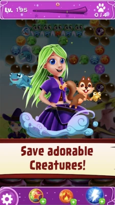 • Sihirli cadıya yardım etmek ve her bulmacada en yüksek puanı almak için tüm baloncukları patlatın!