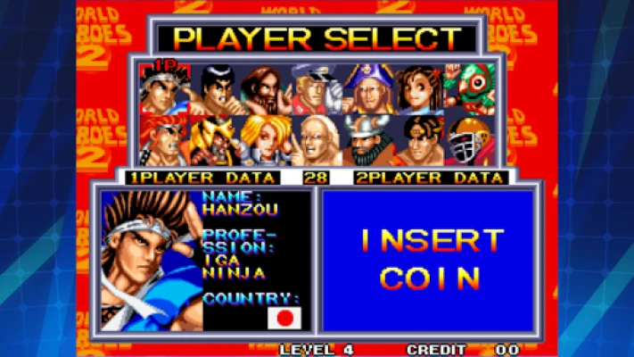 [Game introduction] WORLD HEROES 2 is a fighting game released by SNK in 1993. Players are able to take part in epic battles between 14 historic figures such as Hanzo Hattori and Jeanne. Players can enjoy numerous battle strategies via the simple but deep game system featuring mechanics such as "Throw Back" and "Projectile Bounce Back".