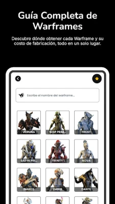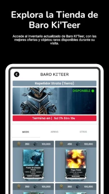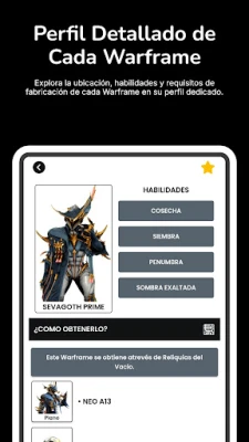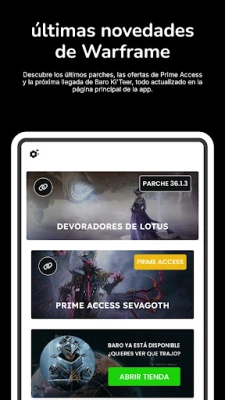 • Baro Ki'Teer: Consulta su inventario actual y la próxima llegada. • Warframes: Accede a una lista completa de Warframes con sus habilidades y estadísticas. • Reliquias del Vacío: Encuentra rápidamente las reliquias y recompensas que necesitas. • Fisuras del Vacío: Información en tiempo real sobre las fisuras activas y recompensas. • Noticias: Mantente informado con las últimas actualizaciones y eventos del juego. • Prime Access: Consulta las ofertas actuales de Prime Access y sus ventajas exclusivas.