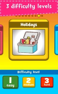Çocuğun yaşına bağlı olarak farklı zorluk seviyelerinden birini seçebilirsiniz. Uygulanacak dil ve ipuçlarının kullanılması ya da kullanılmaması. "Kolay" seviyede çocuk, her kelimeyi hecelemek, okumak ve yazmak için onları öğretmekle ilgili olarak başvuruyla yönlendirilecektir.
