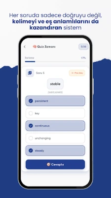 ❓ Etkileşimli Soru Yağmuru: Her kartı tamamladıktan sonra, öğrendiklerinizi pekiştirmek için sizi bir "soru yağmuruna" tutuyoruz. Çoktan seçmeli testlerle kelimelerin eş anlamlılarını ne kadar öğrendiğinizi test edin.