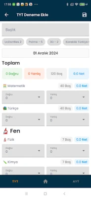 Sınav hazırlıklarınızı daha organize ve etkili bir şekilde yönetmek için tasarlanan YKS Deneme Sınav Takip Uygulamamız ile başarıya giden yolda adım adım ilerleyin. TYT ve AYT deneme sonuçlarınızı detaylı bir şekilde kaydederek, gelişim grafiklerini inceleyerek, ders bazlı analizler yaparak, sınav tarihine geri sayım yaparak, kendinizi sürekli geliştirme fırsatını yakalayın.