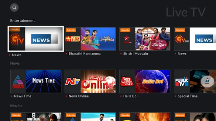 Tamil - Sun TV, Star Vijay, Jaya TV, Kalaignar TV, Raj TV, KTV, Sirippoli TV, Puthiya Thalaimurai TV, Seithigal, Thanthi TV, Chithiram TV, Captain News, Raj News, Sun Music