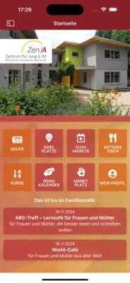 Mit der App wollen wir unsere Vereinsmitglieder, Gäste und Freund*innen direkt, einfach und sicher über aktuelle Angebote und Neuigkeiten aus dem ZenJA informieren. Die Themen bestimmten die Nutzer*innen natürlich selbst über die Auswahl der Push-Nachrichten. Keine Sorge: Wir werden es damit nicht übertreiben. Wer will, kann sich z. B. über freie Plätze in Kursen und Gruppen benachrichtigen lassen. Wir laden auch mal zu spontanen Aktionen im Familiencafé ein und halten uns gegenseitig auf dem Laufenden.