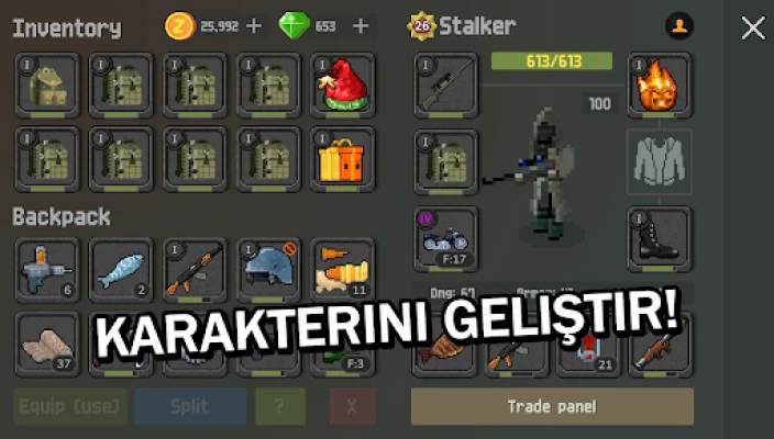 Kahramanınızı, özel tecrübe enjektörleri veya Tüccar'ın görevlerini tamamlayarak geliştirin. Ya da savaş deneyimi kazanmak için zombilerle ve kurtlarla savaşın.