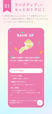 ご帰宅(来店)いただいた際にポイントをプレゼントしています。ポイントを貯めてランクアップすることで、入場料の割引やクーポンがもらえるので、ぜひランクアップを目指してご帰宅してください!