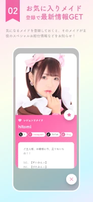 お気に入りのメイドや、よく行く もしくは 気になるお屋敷を登録しておくことで、そのメイド・お屋敷に関連するイベント情報をプッシュでお届けします。毎日イベントがあるあっとほぉーむカフェをたのしみましょう。