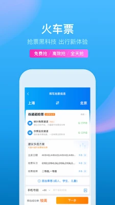 - 火车票:国内外火车票随心订,还支持学生票,儿童票,12306直连购票。全新极速云抢票、上车补票,抢票快人一步更省心;提供退改签及可以私人订制服务,方便又快捷。