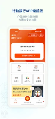 * 專為銀髮族量身打造《行動銀行APP樂齡版》,介面設計化繁為簡,大圖大字大按鈕,更提供貼心問候語、跌倒偵測與緊急求助,優質服務好貼心。