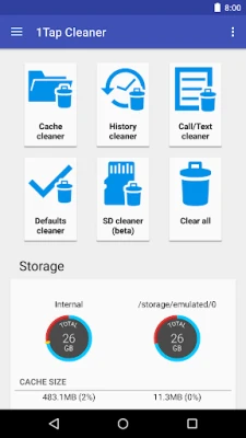 Uygulama 4 temizleyici içerir. Önbellek Temizleyici, Geçmiş Temizleyici ve Arama/Mesaj Günlüğü Temizleyici, uygulamaların önbelleğini, verilerini ve arama geçmişini temizleyerek daha fazla alan kazanmanızı sağlar. Eğer bir uygulamayı varsayılan açıcı olarak atadıysanız, Varsayılan Temizleyici varsayılanlarınızı temizlemenizi sağlar.