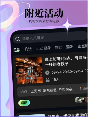 活动展示与推荐:此页面展示了平台上各种丰富多彩的线下组局活动信息,包括活动主题、时间、地点、活动内容简介以及参与人数限制等。活动主题涵盖了文化艺术、运动健身、社交聚会、公益志愿等多个领域,满足不同用户的兴趣爱好和社交需求。例如,有艺术展览参观活动、马拉松比赛组队活动、单身派对交友活动、环保公益植树活动等。平台会根据用户的个人资料和历史活动参与记录,为用户推荐一些可能感兴趣的活动,同时也会展示一些热门活动和即将截止报名的活动,方便用户及时发现并参与到自己喜欢的活动中。