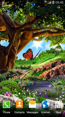 Animated 3D butterflies, amazing spring landscape with myriads of flowers, live stream that flows under a sprawling tree, animated clouds and dandelion seeds. All this and even more can be found in these amazing free 3D live wallpaper. Install it, and it will give you the feeling of a sunny summer day, the coolness and freshness in the shade near a rapid stream. Enjoy the beauty of the flower meadow. See how gracefully fly real 3D animated butterflies. This live wallpaper will be a perfect decoration for your phone or tablet and will please you for a long time.