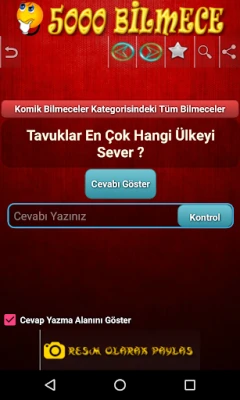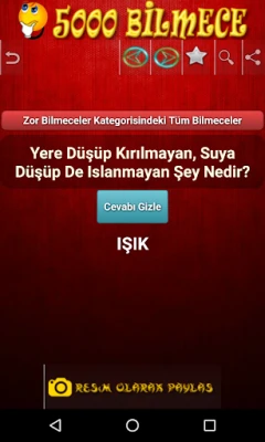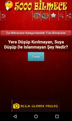 Bunlardan en önemlisi beğendiğiniz bilmeceyi resim formatına dönüştürerek istediğiniz ortamda paylaşabilirsiniz. İster facebok twittir gibi sosyal ağlarda, ister mms olarak yollayabilir, yine isterseniz whatsapp gibi mesajlaşma uygulamaları üzerinden arkadaşlarınızla paylaşabilirsiniz. Aynı şekilde bilmeceleri yazı formatında da arkaşlarınızla paylaşabilirsiniz.