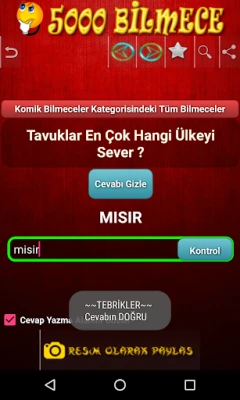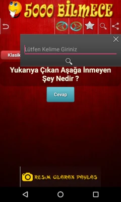 Evet yanlış okumadınız. Tam 8 kategoriye ayrılmış 4950 adet bilmece.Kesinlikle internet bağlantısına ihtiyaç duymaz. Üstelik her birinin cevabı elinizin altında. Kullanımı kolay, anlaşılır arayüze sahip bir uygulamadır.