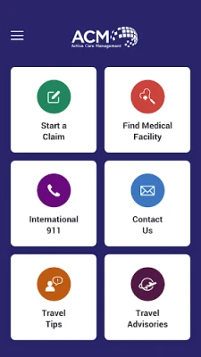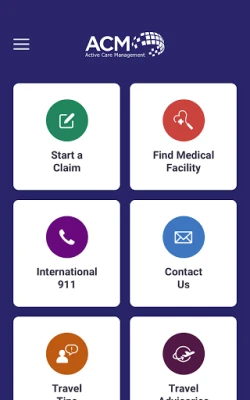 Features of the ACM TravelAid include: • Medical Facility Search – Find directions to the closest medical facility (GPS enabled) • International 911 Lookup –Search emergency phone numbers in other countries (GPS enabled) • Travel Tips – For traveling Canadians and visitors to Canada • Start a Claim – Begin the process to file a claim and track your claim status • Contact ACM – A direct link to ACM for immediate medical assistance 24/7