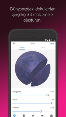 Gerçekçi PBR malzemeleri oluşturarak doğrudan kameradan 3D tasarımınızda kullanın. Daha fazla doku için malzemelerinizi değiştirin veya 3D nesnelerinizde döşemeyi sorunsuz bir şekilde tekrarlamak için kenarları karıştırın.