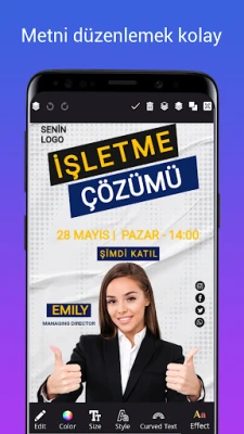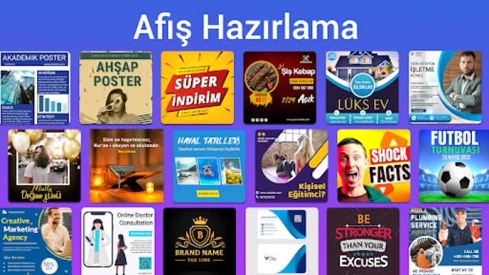 Gelişmiş özelliklere sahip poster yapımcısı ve video yapımcısı programı, kendi posterinizi tasarlamanıza yardımcı olur, broşür, video reklam broşür, el ilanı hazırlama, doğum günü davetiye kartlarını, selamlarını, festival etkinlik afiş, iş satış afiş tasarımı, ilan afiş, yemek broşürünü tasarlamana yardımcı olur, youtube banner thumbnail görüntüleri ve profesyonel bir grafik tasarımcı gibi sosyal meadia için grafikler.