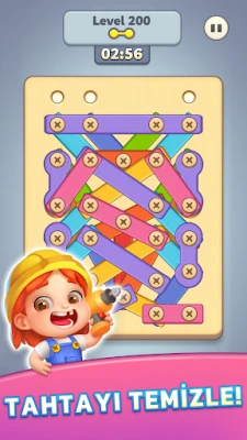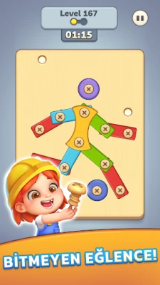 Ahşap levhaları, somunları ve vidaları sıkıştırarak veya gevşeterek bulmaca çözme becerilerinizi zorlayın. Karmaşık ahşap yapıların kilidini açmak için doğru yolu bulun!