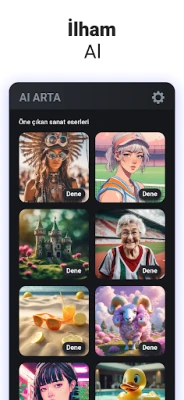 Tüm dünya genelinde farklı kişilere tarafından yapılan muhteşem yapay zeka sanatlarından oluşan galeriye göz atın ve ilham alın. Diğer insanların fikirlerini inceleyin ve yapay zekanın gücünü kullanarak yapay zeka sanatı yaratmaya başlayın!