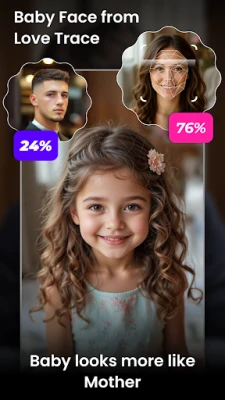 This powerful baby face predictor with photo gives you a realistic glimpse of your future child by combining the best facial traits from both parents. And ever wondered whether your baby will look more like mom or dad? The app calculates a fun "Love Blend Score" to show which features dominate in your baby’s face.