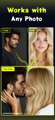 1 - Download Ai Kiss App to your phone 2 - Choose 2 photo that you want them to kissing in the video 3 - Wait a little bit to generate your video 4 - Your Ai Kiss Video is generated! Share with your friends.
