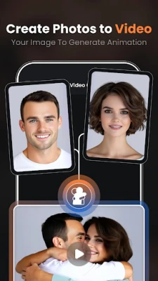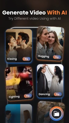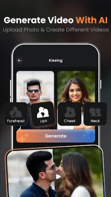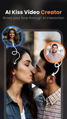 AI Kissing Video Generator app makes it incredibly easy to create these stunning videos, even if you have no prior video editing experience. The AI Photo Video Generator allows you to browse through your gallery or upload new images and then convert your photos into various animation effects. Once you've selected your images and animation style, the AI Video Maker app will do the animations in photos by your choice of effects. You can save your creations in the My Creations app and share them with friends, family, or on social media. Whether you're looking to add animations to photos, add a personal touch to a special message, or simply want to have fun experimenting with creative animation, the AI Kissing Video Generator app is the perfect tool for you.