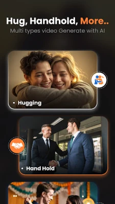 AI Kissing Video Generator is an amazing tool that lets you turn any two different images into captivating video animation clips. With the AI Kiss Video Generator app, you can create mesmerizing videos with a wide range of motions, including kissing, hugging, fighting, dancing, handholding, and cuddling. With AI Video Maker, simply select two images, and with just a tap on the generate button, the AI will transform them into engaging different animations like AI Kiss Video, AI Hug Video, AI Dance Video, AI Holding Hands Video, and also an AI cuddling video clip that's sure you did like real with photo animations.