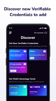 - Securely store and share verifiable credentials like digital ID cards, re-usable KYC, diploma, age verification (over 18), proof of email and more.