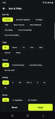 Filter Your Way 🎛️: Customize with filters for Order, Type (TV, Movie, OVA, ONA) 🎬, Status (Airing, Finished) 🏁, Rating (G, PG, R...) 🎭, Score (1-10) 🌟, and Genres! 🎨