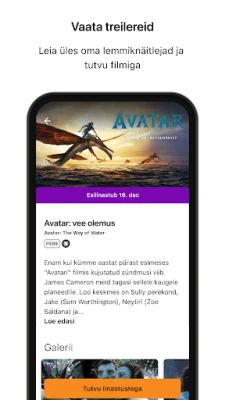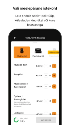 Sirvige kinokavasid, vaadake treilereid ja ostke kinopileteid tulevaste filmide jaoks. Kinosaalidele mugava juurdepääsu võimaldamiseks kasutage digitaalseid kviitungeid. Veelgi nauditavama kinoelamuse saamiseks kasutage iseteeninduskioskites suupistete ostmiseks oma konto ID-d.