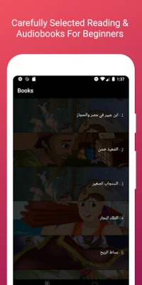 Uygulamadaki kitaplar; - ابن جبير في مصر والحجاز - السَّعيدُ حَسَن - السنجاب الصغير - الملك النجار - بساط الريح - تاجر بغدَاد - حِذَاءُ الطُّنْبُورِيِّ - حكاية بهلول - كَنْزُ الشَّمَرْدَلِ - ليلى والذئب - نارادا - وَزَّةُ السُّلْطَانِ