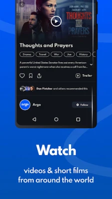 Argo is where innovative storytelling is born. We are changing the way you watch, share and discover content you love, without the algorithm trap. Everyone here is a curator and everyone can earn revenue from sharing content. Take a short break and escape from the mundane into the world of imagination. Watch on your phone, laptop, tablet, or on the big screen (WatchArgo.com / ROKU / AppleTV) Argo: Artists Going Places