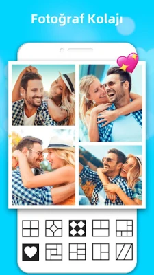 Aşk kolaj uygulamamız serbest fotoğraf kolajları yapmanızı sağlar. Harika aşk kolajı yapmak için aşk dolu anları çeşitli aşk fotoğraf çerçeveleri ve düzenleriyle sabitleyin. True love çerçeveleri ve aşk kolajının mükemmel uyumu ile tam özellikli bu fotoğraf kolajı oluşturucu, sonunda inanılmaz true love fotoğraf kolaj albümleri oluşturur. Fotoğraf kolajı oluşturucumuz ve fotoğraf kolaj düzenleyicimiz aşk anlarının en iyi dijital bellek koleksiyonlarını sunar.