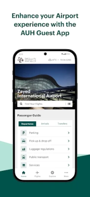 AUH Guest is the official Zayed International Airport mobile application, designed to assist passengers in finding essential information and ensure seamless experience throughout their journey at Airport’s Terminal A.